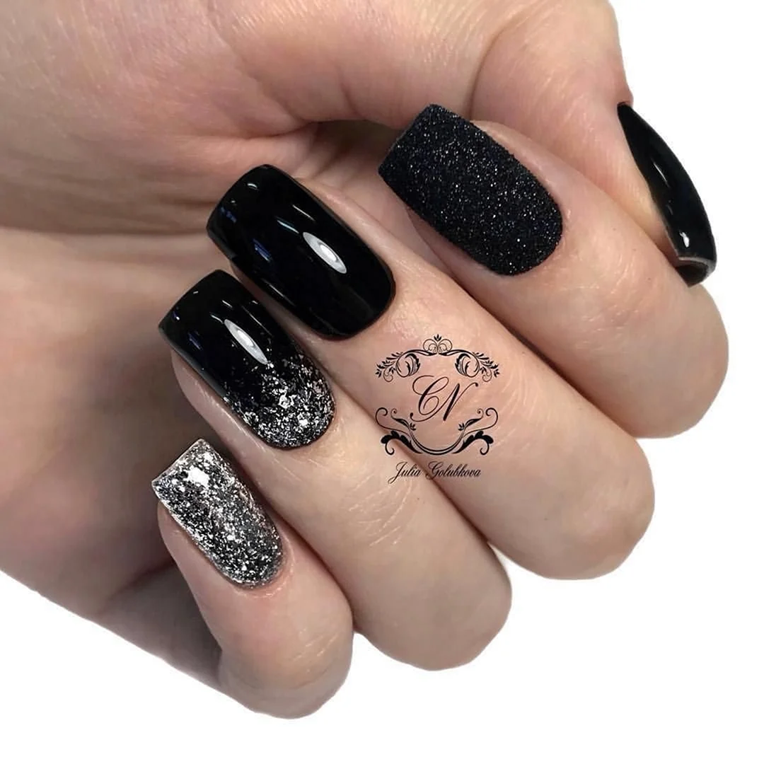 Чорний манікюр на квадратні нігті можна прикрасити різноманітними елементами декору: